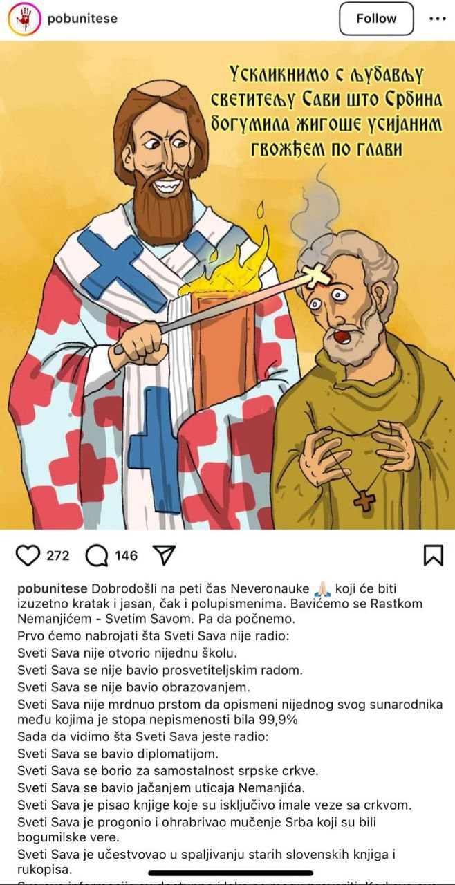 На свом Инстаграму наводе да ће „одржати лекцију“ и „час Неверонауке“, уз срамотне речи чиме се Свети Сава није бавио.