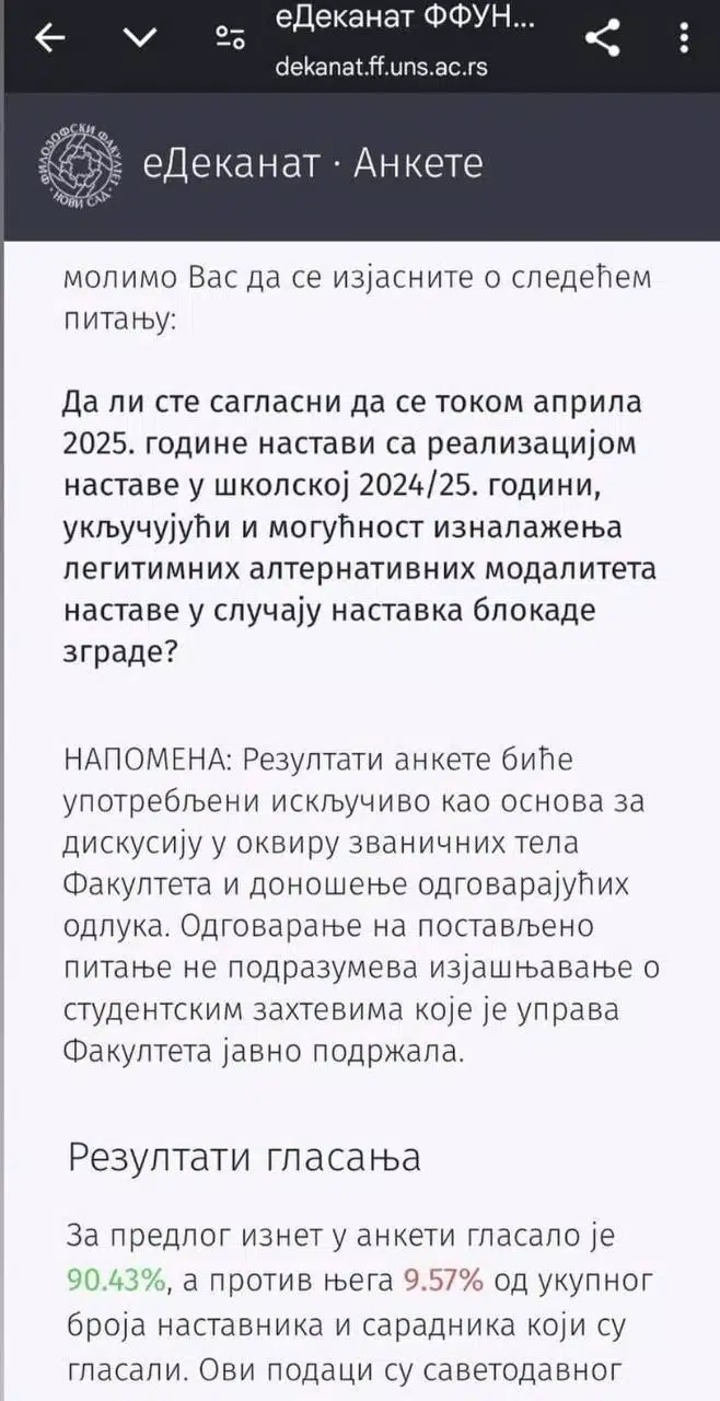 Филозофски факултет у Новом Саду спровео је анкету међу наставним кадром да ли су за наставак наставе или за наставак блокада.