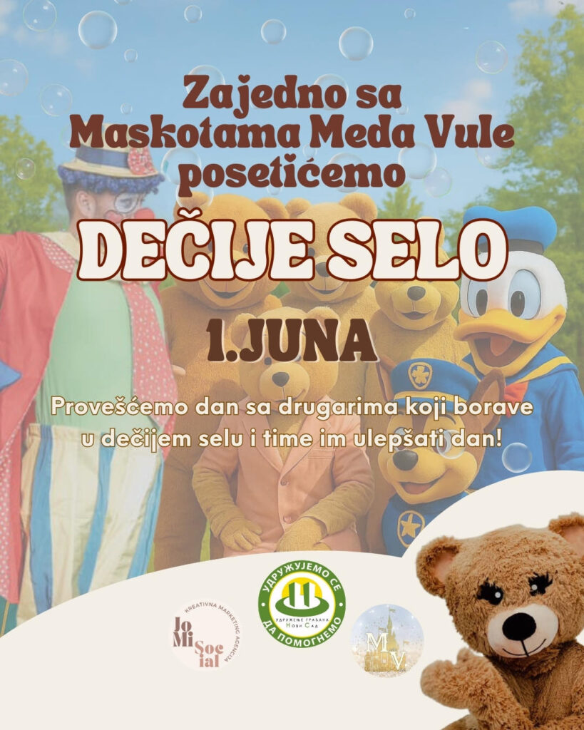 Удружење грађана „Нови Сад“ у сарадњи са маскотама „Меда Вуле“ организује хуманитарну акцију под називом „Маскота за свако дете“, која ће се одржати 01. јуна 2025. године, у времену од 10 до 11 часова, у дворишту Дечјег села „Др Милорад Павловић“.