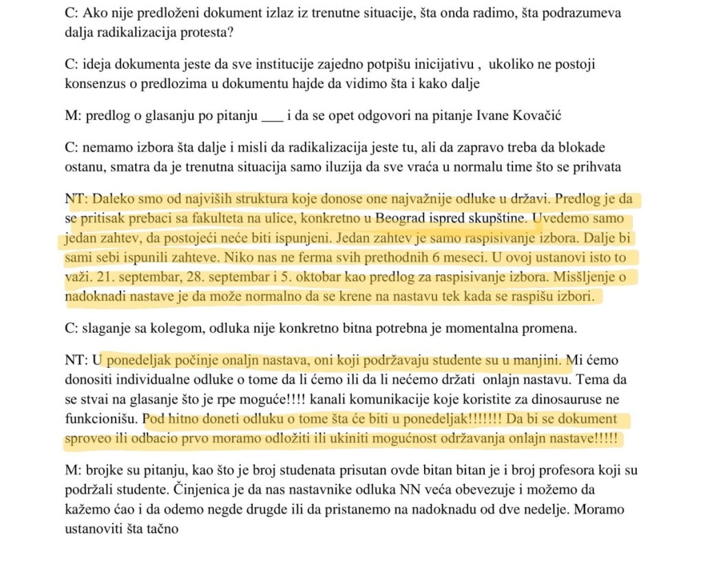 – Далеко смо од највиших структура које доносе оне најважније одлуке у држави. Предлог је да се притисак пребаци са факултета на улице, конкретно у Београд испред скупштине. Уведемо само један захтев, да постојећи неће бити испуњени. Један захтев је само расписивање избора – пише између осталог у записнику.