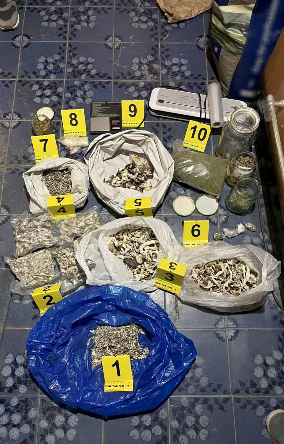 Претресом просторија које користе осумњичени, на више локација у овој општини, пронађено је око 4, 4 килограма психоактивних печурака, 2, 5 килограма марихуане, 190 грама хашиша, око 60 грама амфетамина и тегла са семенкама индијске конопље.