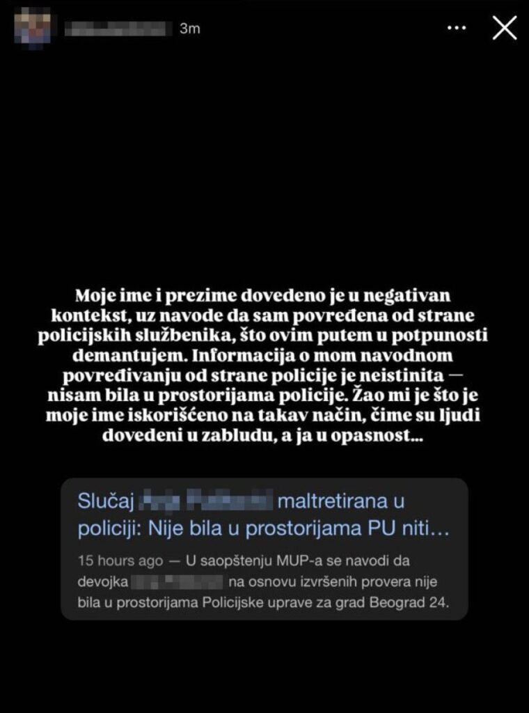 “Моје име и презиме доведено је у негативан контекст, уз навоед да сам повређена од стране полицијских службеника, што овим путем демантујем. Информација о мом наводном повређивању од стране полиције је неистинита – нисам била у просторијама полиције. Жао ми је што је моје име искоришћено на такав начин, чиме су људи доведени у заблуду, а ја у опасност“, написала је А. П.