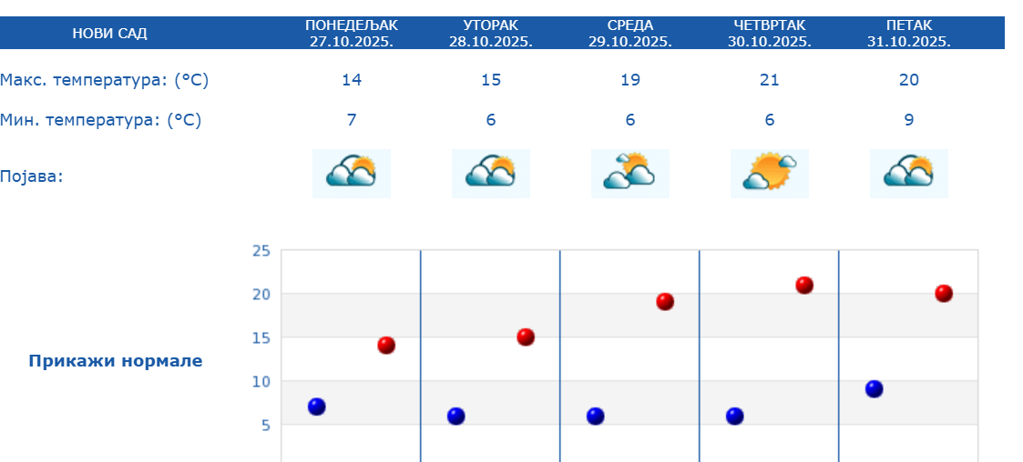 У Новом Саду овог јутра облачно, са 8 степени. Током дана разведравање и сунчаније, а температура ће ићи до 14. подеока. Најтоплији дан ове седмице у Српској Атини биће четвртак, када се очекује 21 степен.