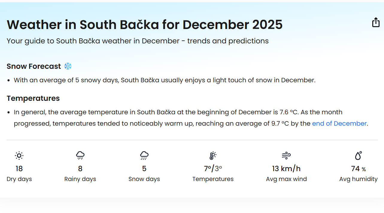 Сличне вредности очекују се и за Нови Сад. Према подацима Ease Weather, за област Јужно‑Бачке наведено је да ће током децембра бити око 5 дана са могућим снежним падавинама.