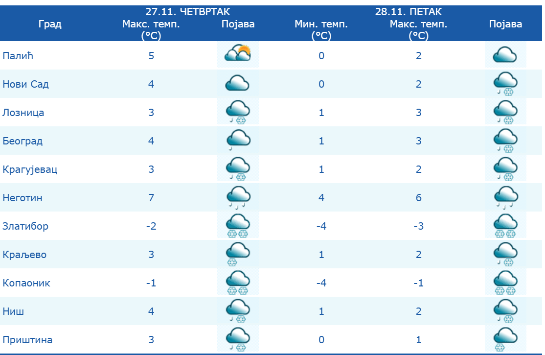 До суботе (29.11.) претежно облачно и хладно с честом појавом кише и снега. Повремене епизоде јачег снега које се у брдско-планинским пределима очекују у прекидима условиће смањену видљивост и задржавање снежног покривача на коловозу. Пролазне епизоде јачег снега биће чешће у вечерњим и ноћним сатима када ће се снег задржавати и на појединим локалитетима у нижим пределима, углавном у западним, централним и југозападним крајевима Србије. У области Хомољских планина и на југоистоку у истом периоду прогнозирају се мешовите падавине (киша и снег), а услед ниских температура, киша се у вишим пределима местимично може ледити на тлу. Опрез се пре свега саветује свим учесницима у саобраћају.