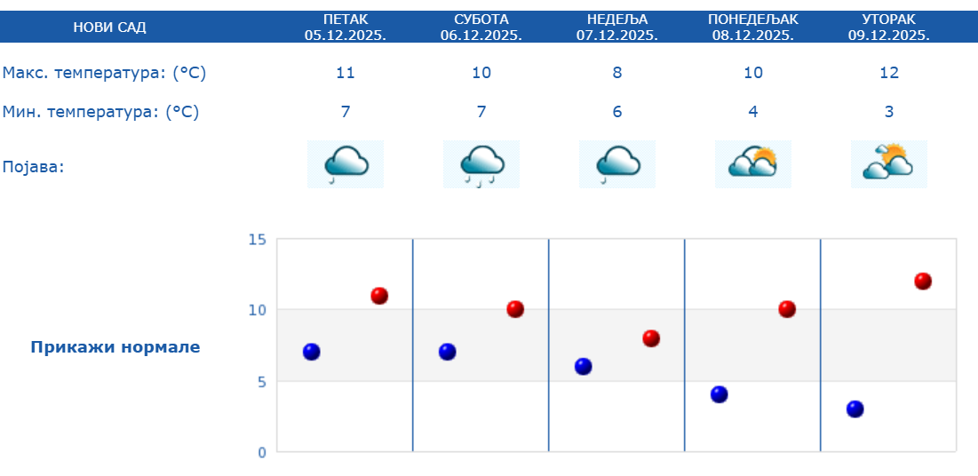 У Новом Саду и даље дува јак ветар, а тренутна температура је 10 степени. Слаба киша се може очекивати током дана, а максимална дневна биће 12 степени. Током викенда кишовито, а температура неће прелазити 12. подеок.