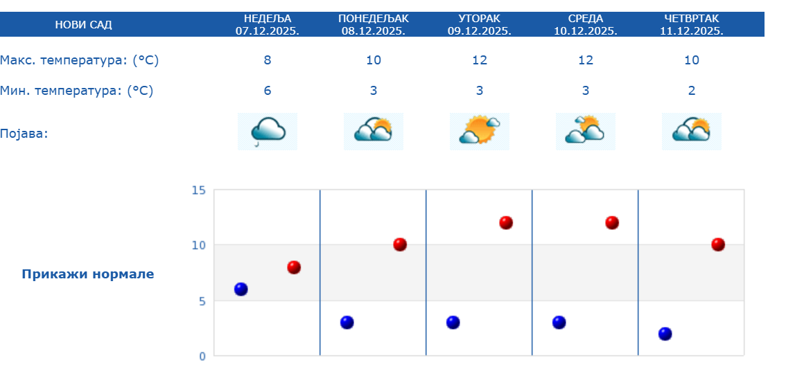 У Новом Саду освануло је облачно јутро, са 6 степени. Пада слаба киша. Током дана максимална температура биће 8 степени, док нас од сутра до четвртка очекују више температуре са сунчаним интервалима.