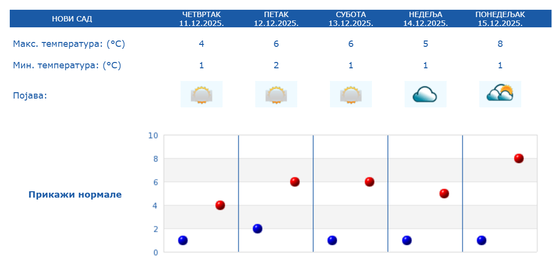 Нови Сад је овог јутра један од најхладнијих градова у Србији, са само 2 степена. Предњаче Сремска Митровица и Пожега са 0 степени, а јутрос у 7.00 часова температуре у минусу су забележене у Краљеву, Зајечару, Сјеници, Лесковцу и Врању. Током дана у Српској Атини очекује се задржавање магле, која је још синоћ пала на град. Максимална дневна биће само 4 степена, а магла ће се задржати до недеље.