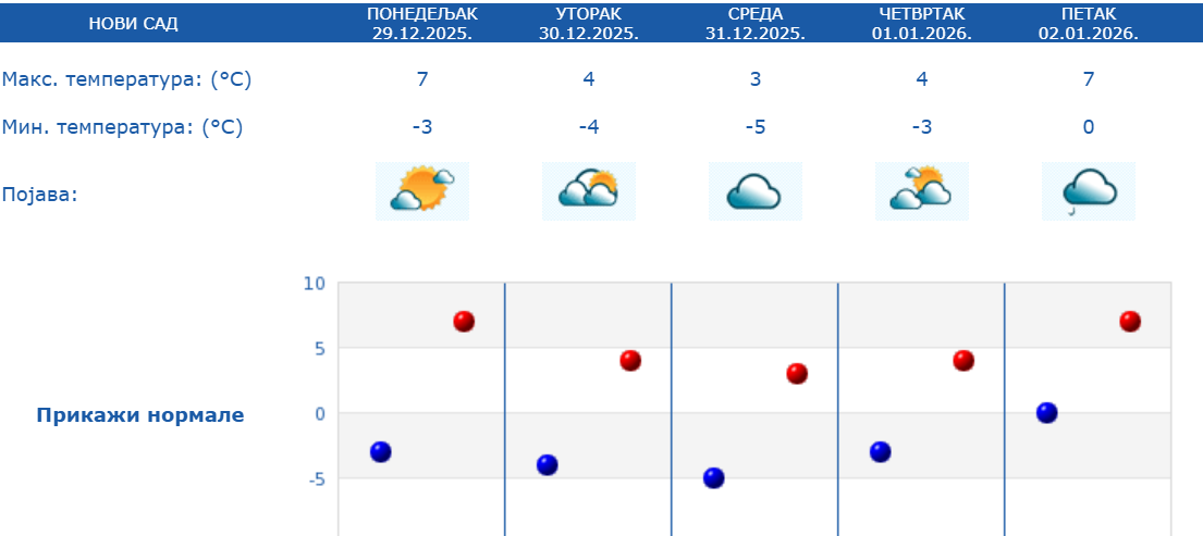 У Новом Саду су два степена испод нуле. У 7.19 часова свануће дан са више сунчаних интервала и максималних 7 степена, што је у просеку за ово доба године.