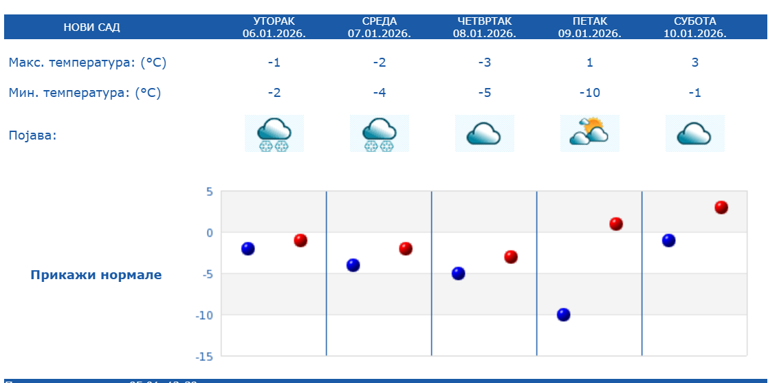 У Новом Саду тренутно -2 степена, што га чини међу три најхладнија места шестог јануарског дана. Прате га Палић и Сомбор, са истом температуром. Тренутно облачно време, а у поподневним часовима може се очекивати снег.