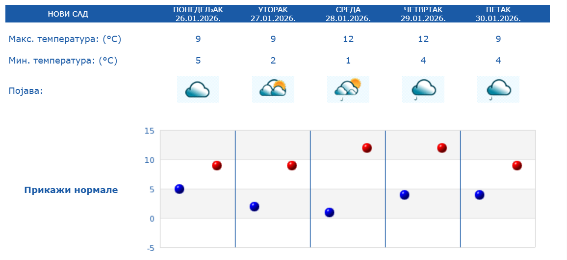 Данас умерено до потпуно облачно, на северозападу Србије углавном суво уз локалну појаву јутарње магле, а у осталим крајевима местимично киша. Метеоролози најављују могућ снег на високим планинама.