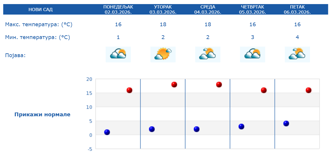 У Новом Саду тренутно су 2 степена. Током преподнева очекује се постепено наоблачење, али ће се задржати суво време. Температура иде до пријатних 16 степени.