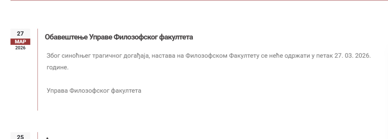 -Због синоћњег трагичног догађаја, настава на Филозофском Факултету се неће одржати у петак 27. 03. 2026. године- стоји на сајту ове образовне институције.
