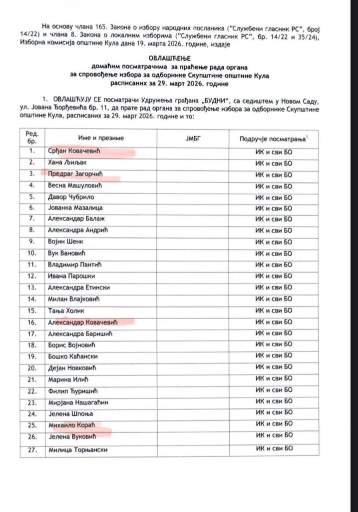 Изборни дан пратиће и адвокати Драгана Ђиласа и пословни сарадници Горана Јешића- браћа Срђан и Александар Ковачевић. Пошто им посао са Зборовима грађана Новог Сада не иде како су замисли, сада се фокусирају на Кулу, да и ту покушају да муте на бирачким местима. Са њима је и координаторка поменутих Зборова, извесна Хана Љиљак. Такође, испред тог истог удружења грађана „БУДНИ“, налазе се и опозициони чланови Покрајинске изборне комисије, као и родитељи деце који су се залагали за блокаде наставе у прошлој школској години наводи НС уживо.