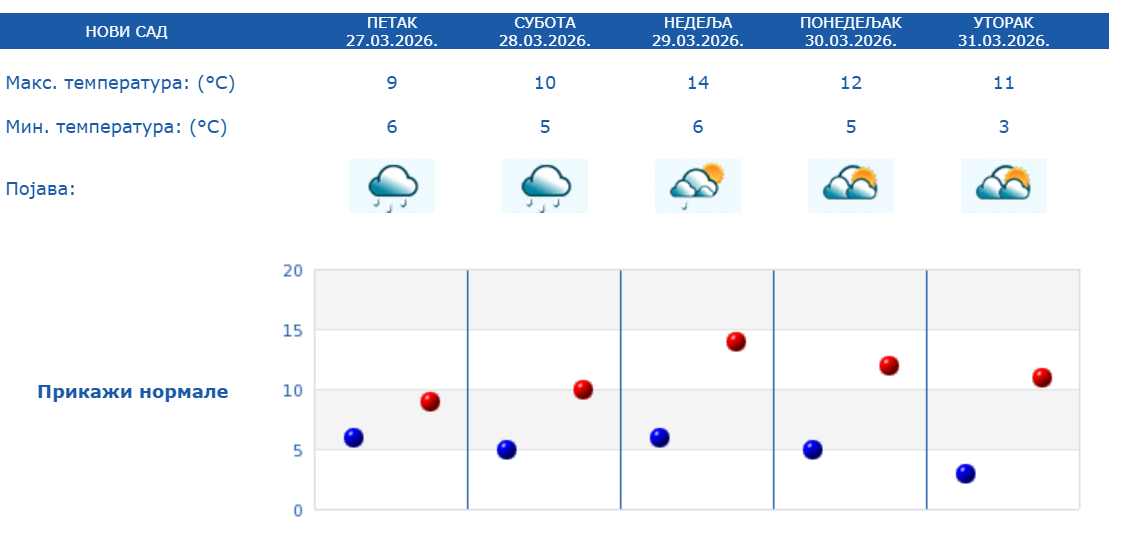 За викенд и у понедељак (28.-30.03.) облачно повремено са кишом и локалним пљусковима, у брдско-планинским пределима са снегом уз повећање висине снежног покривача. Локално се очекују и обилније падавине. У понедељак после подне постепени престанак падавина.